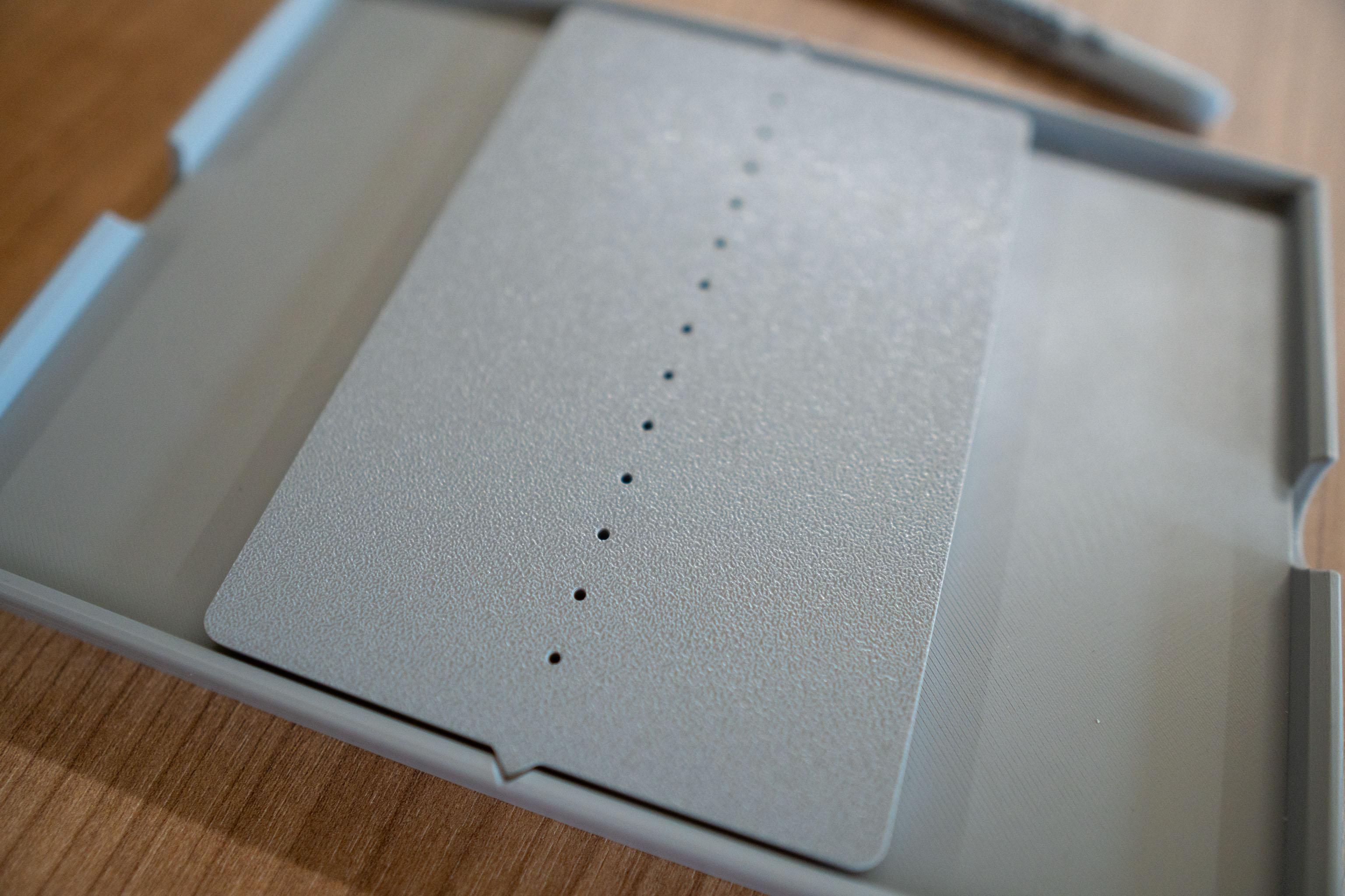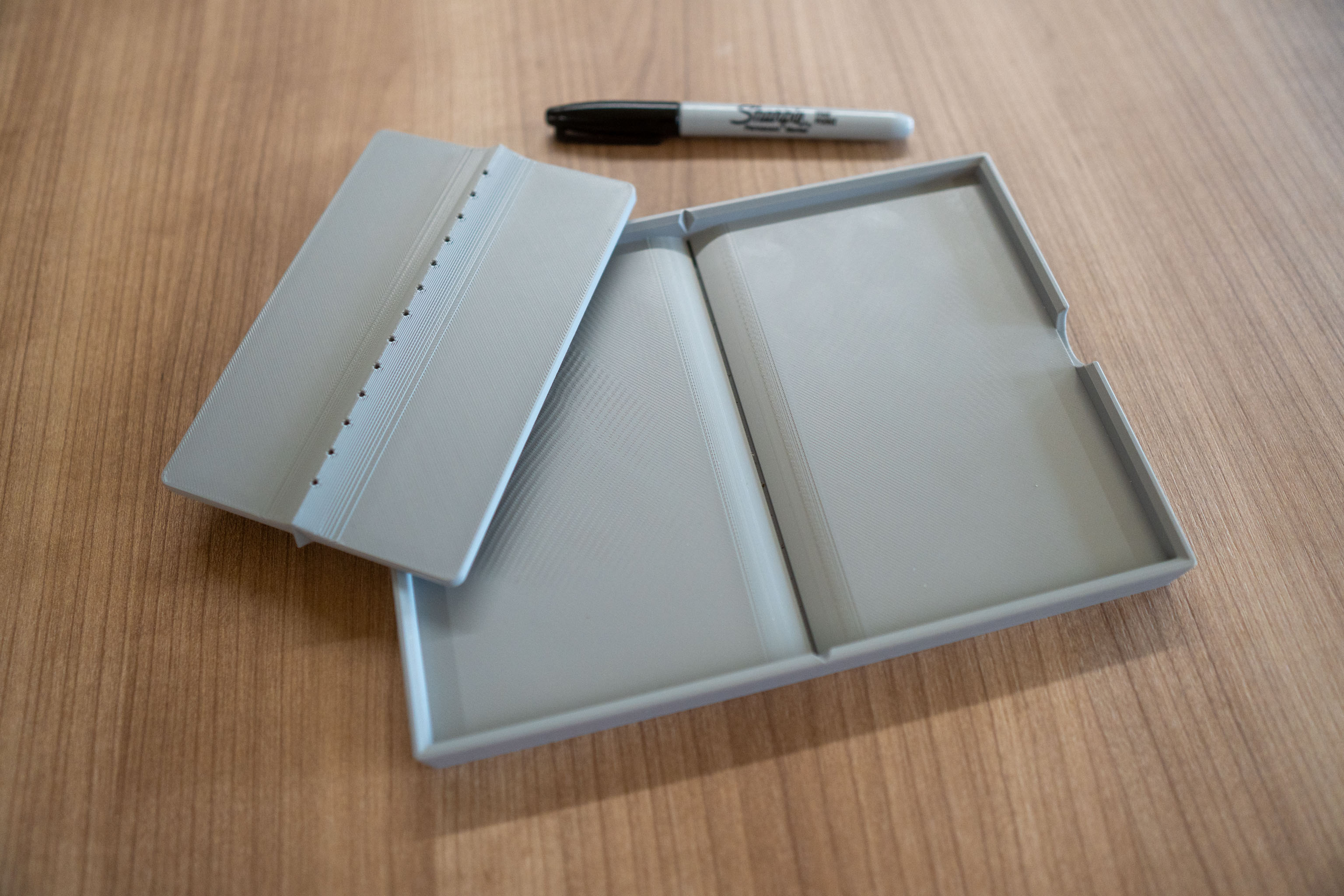 I redesigned the notebook carrying box a bit. And by "redesigned" I mainly mean making it a little deeper and a little wider on each side, just 2mm. But now I can carry all the pages and covers I need to make some notebook home, and then easily pack the stitched notebooks back to the studio for trimming.